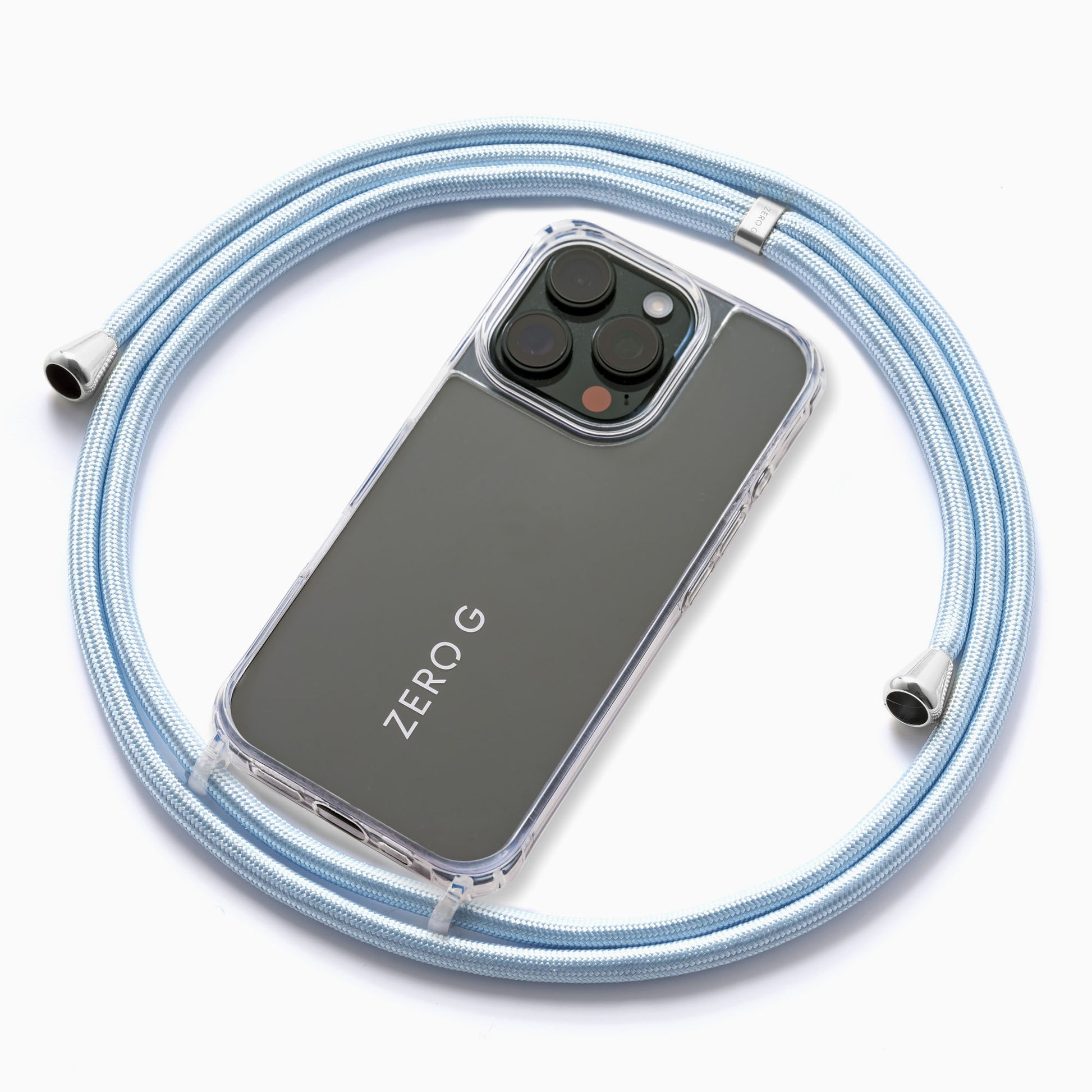 Dieses Smartphone Necklace wirkt trotz der etwas dickeren Schnur luftig leicht durch das schöne hellblaue Band.